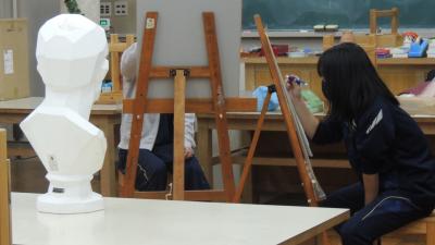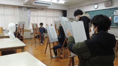 今回は、前回取り組んだデッサンの仕上げを行いました。画面に奥行きを与える「遠近感」と、対象の立体感をより際立たせる「明暗」のコントラストを強く意識するようにと、具体的なアドバイスがありました。生徒たちはその指導を真剣に受け止め、自身の作品とじっくり向き合い、制作に没入していく様子がひしひしと感じられました。熱気のある集中した時間が流れていました。