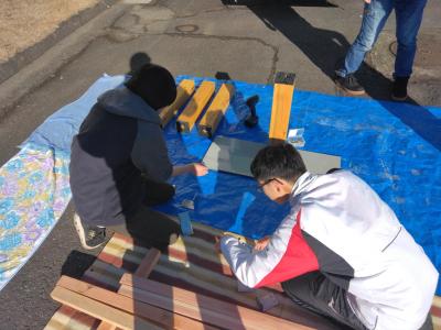 リリー文化デザイナー学院の学生の皆さんと協力し、テーブルとチェアの組み立て・設置を行いました。長く安心して使えるよう、防水・防腐処理を施し、水平や強度などの安全面も入念に確認しています。
