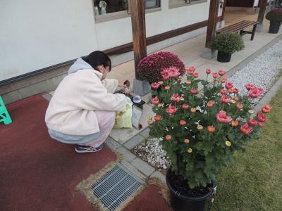 あいにくの雨とはなりましたが、途中で虹が出る時間帯もあり、生徒たちは思い思いに門前を散策しています。自分たちで育てた菊も見つけることができ、研究の成果が、実際に地域に貢献できていることを実感できたと思います。